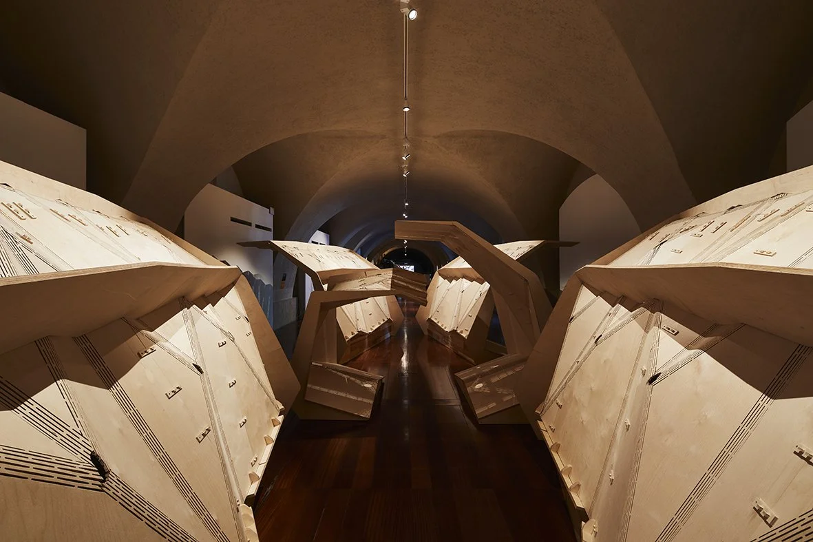 Turning the attention to interior design, the Polish pavilion explored the ways in which textiles are used to reflect the rhythm of seasonal changes in domestic interiors. As well as sumptuous shades and sweeping forms, the space also called upon ancient rituals as a means to inspire contemporary climate-responsive design.