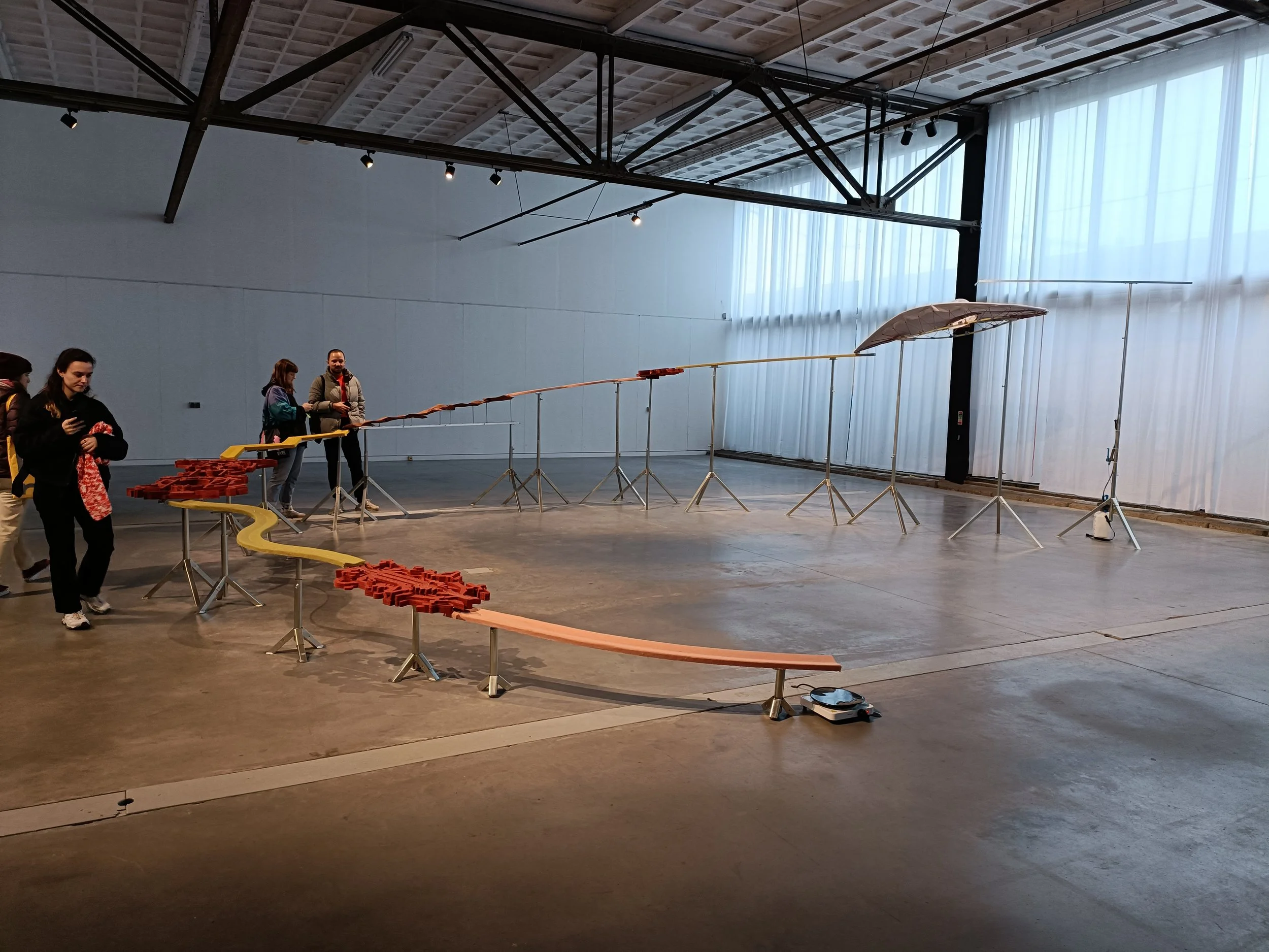 Another installation found over at Dutch Invertuals drew attention to the cycle and flow of water, albeit with a rather more playful approach. Flow is a water fountain-cum-marble run, with a perilous ending for the beads of water akin to the board game Mousetrap. Utilising gravity, water is released from atop a stilted structure made up of various sections of felt and textile-covered forms. Each has its own characteristics and shape, with channels funneling the water down the swooping, staggered ramps, until they finally drop off their last edge…onto an ever-on hot plate.